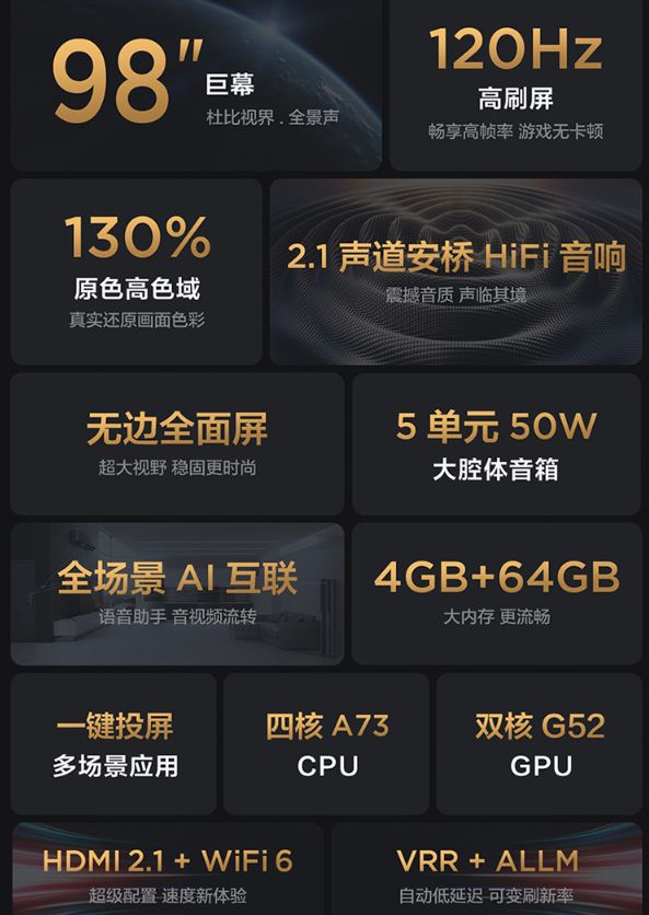 最后就是我最喜欢的TCL 98''IMAX 巨幕智屏Q6E,2万出头的价格,98英寸大屏、800nit峰值亮度、6000比1静态对比度、120Hz刷新率、130%色域、50W ONKYO音响、还支持音视频流转和四路投屏,配合HDMI 2.1接口,可以实现4K120Hz的游戏体验,综合硬件素质算是最高的。