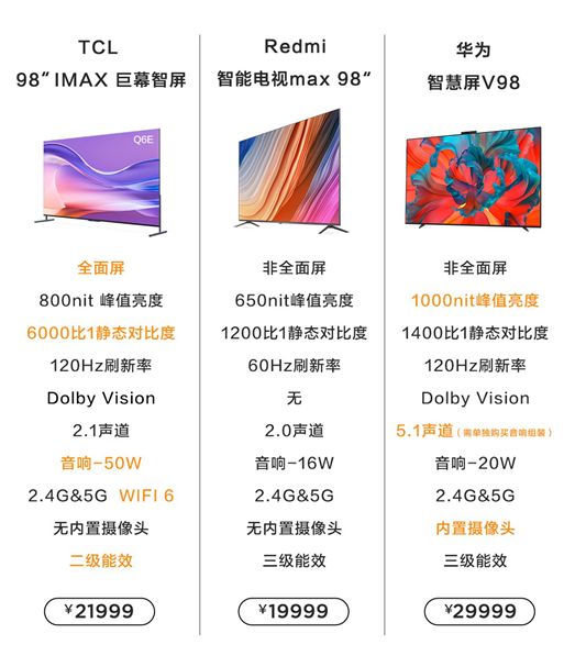 TCL之后,华为也不甘示弱,在7月底的时候发布了29999的智慧屏V98,宣告正式踏入超大屏市场。这也意味着三款3万以下的98英寸的巨幕都出自中国企业,其中最便宜的就是售价仅为19999元的Redmi智能电视MAX 98英寸智能电视,其次是21999的TCL 98''IMAX 巨幕智屏Q6E,以及29999的华为智慧屏V98,这可相比国外品牌动辄10万级的狠价良心多了。