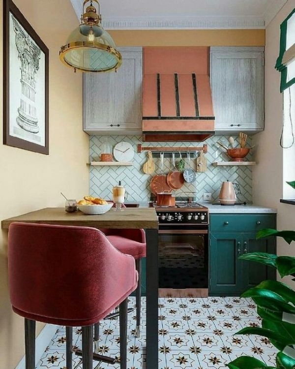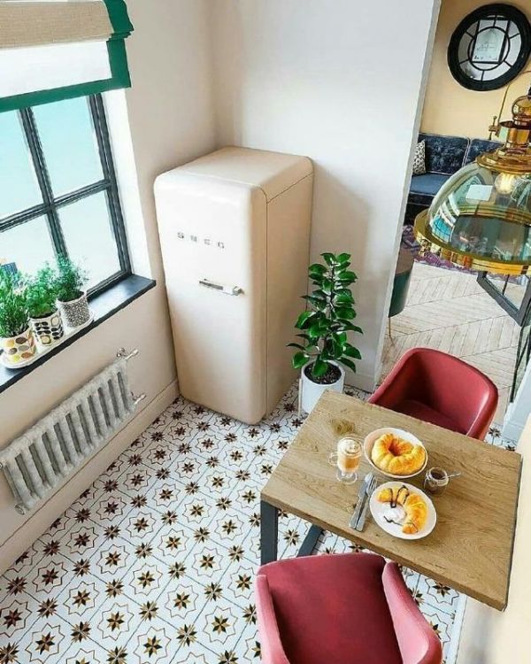 而入户玄关的左侧,就是一个小小的餐厅。原木风的方桌,搭配两张红色的皮质餐椅,一眼望过去,是满满的温馨感和复古风。墙角位置,还放置了一个早些年前置换的粉色冰箱。
