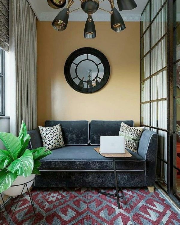 书桌的后方,就是一个藏蓝色的沙发,一张格纹的灰红小地毯,再搭配一盆绿植和一组茶几,就是属于顾阿姨的小小客厅,一个人坐在这里,看看电脑,追追剧,一个人的生活,简单却美满。