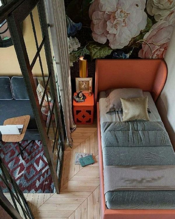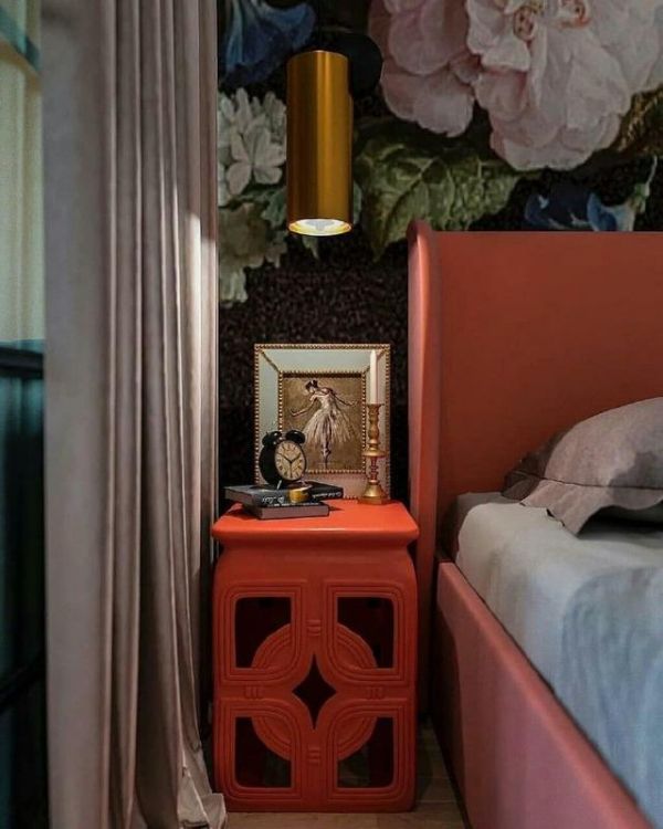 而顾阿姨的卧室空间,也拥有浓郁的复古孩子调,一组脏粉色的单人床,一个复古风的床头柜,一个金属床头灯,还有一整幅花作背景墙,整个卧室小而温馨。