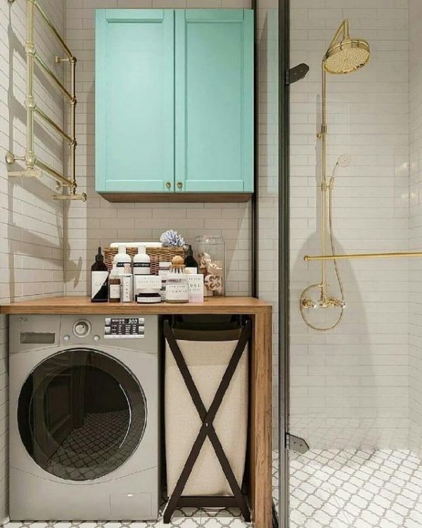 洗浴区的设计,则加入了洗衣机和橱柜设计,整体显得井然有序。