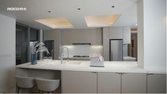 充分了解焦刘洋的日常家居生活需求后,本间贵史先生从历年家居潮流中,选取经得起时代考验的经典色调——柏林之风V3,主打是现代简约风,珍珠白和胡桃色的结合增添了温馨的味道。客厅是全家人的生活主场,也是会客的社交场地,所以本间贵史先生主张客餐厨一体化空间格局,打造社交式餐厅,促进人与人之间的情感交流。