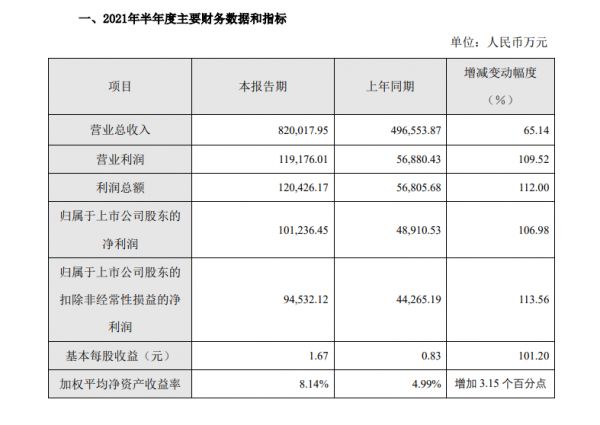 8月12日,欧派家居发布2021年半年度业绩报告,报告称,公司实现营业总收入82亿元,同比增长65.14%;实现归属于上市公司股东的净利润10.12亿元,同比增长106.98%。