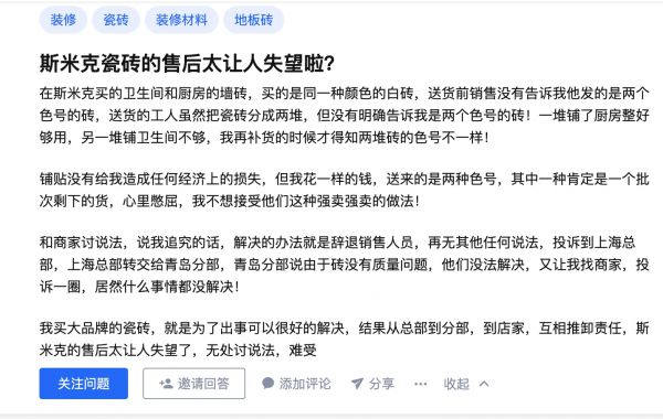 售后、品控双重“滑铁卢”,斯米克瓷砖口碑屡翻车