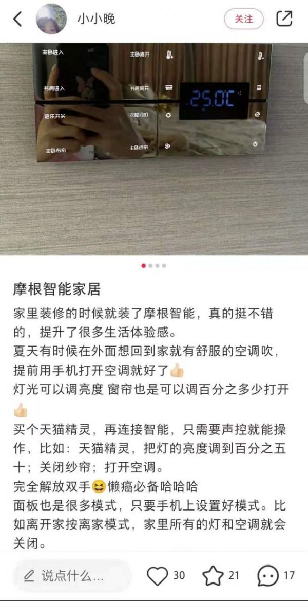 “小小晚”则晒出摩根智能面板大赞:“家里装修就转了摩根智能,真的挺不错,提升了很多生活提亚干。面板也是很多模式,只要在手机上设置好模式,比如离开家按离家模式,家里所有灯和空调就会关闭。智能家居还是很提升生活幸福感的。”