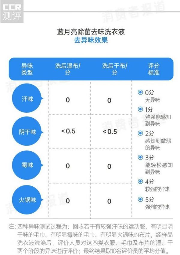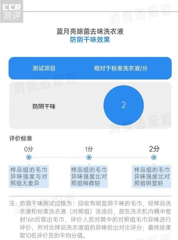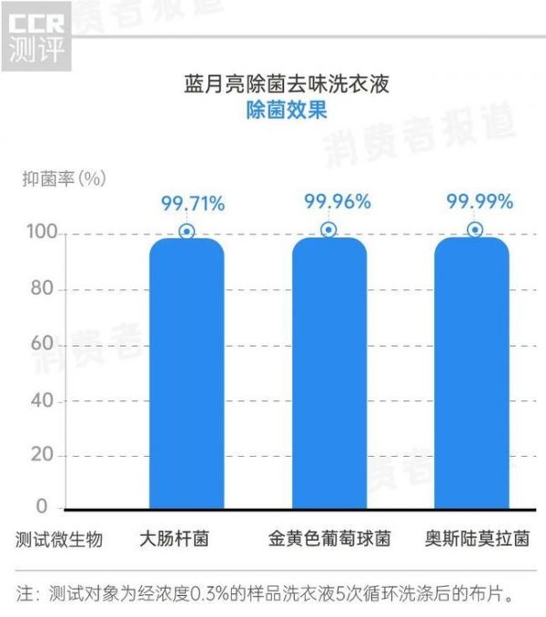 2021年8月,《消费者报道》对一款宣称可“高效除菌,去味抑味”的蓝月亮除菌去味洗衣液进行了检测,包括去异味效果、防阴干味效果、除菌效果、实际去渍效果、皮肤刺激性试验等多项指标。