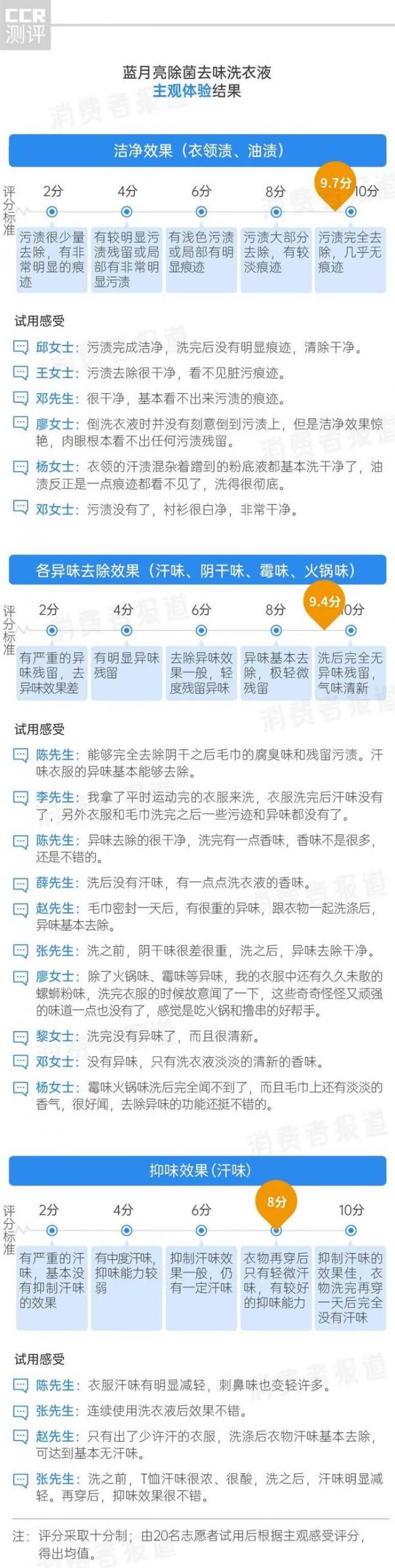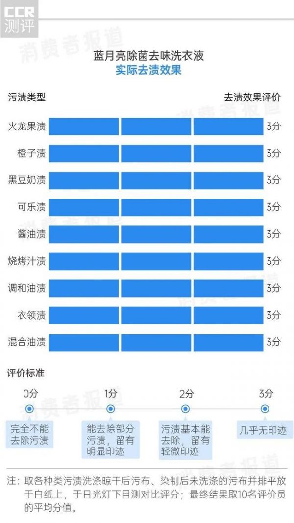 将制备好的各类污布经过此款蓝月亮除菌去味洗衣液洗涤后,与未洗涤的污布并排放在白纸上,由10名评价员于日光灯下目测对比评分。