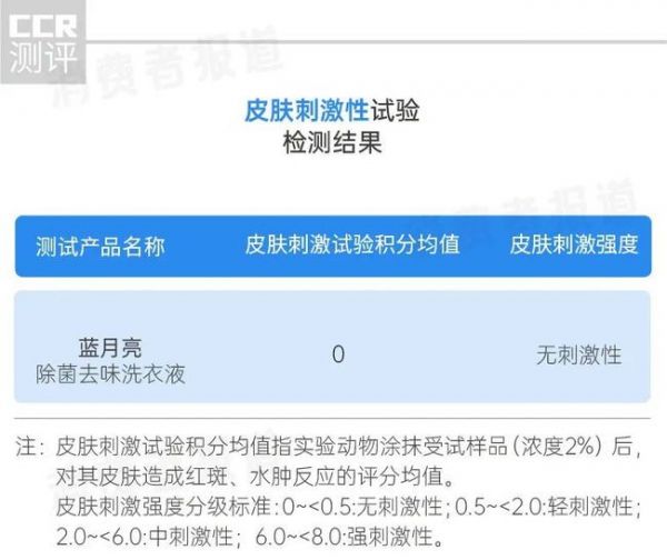 此次我们也对这款蓝月亮除菌去味洗衣液的皮肤刺激性方面进行了检测,按照2%的浓度(常规使用浓度的10倍用量)稀释后,结果显示,皮肤刺激试验积分均值为0,表示无刺激性,的确是一款温和可手洗的洗衣液。