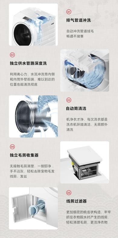 通过排气管道冲洗、独立供水管路、自动筒自洁、独立毛屑收集器、线屑过滤器五个方面入手,东芝X9深度解决了毛屑堵塞管道、滚筒内残留毛屑、衣物上毛屑不易清洗等多方面问题,对于每一个有宠家庭来说确实可以告别这些小家伙带来的毛发困扰。
