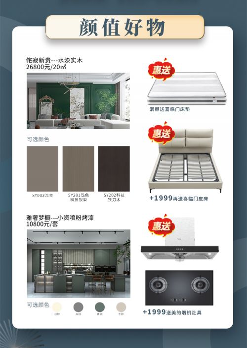 两大主推产品:侘寂新贵---水漆实木;雅奢梦橱---小资喷粉烤漆。客来福以颜值取胜,在色板和产品的研发上颇为考究,兼顾市场差异化,针对不同的消费群体推出的侘寂和雅奢,在强化消费者认知的同时,打造属于客来福的产品特色。