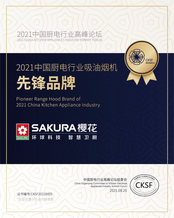 SAKURA樱花在2021中国厨电行业高峰论坛上荣获“2021年中国厨电行业吸油烟机先锋品牌”,这是对SAKURA樱花坚持高质量品牌发展的充分肯定,也体现了SAKURA樱花凭借着技术创新领域的深耕和实践,不断突破的品牌形象。