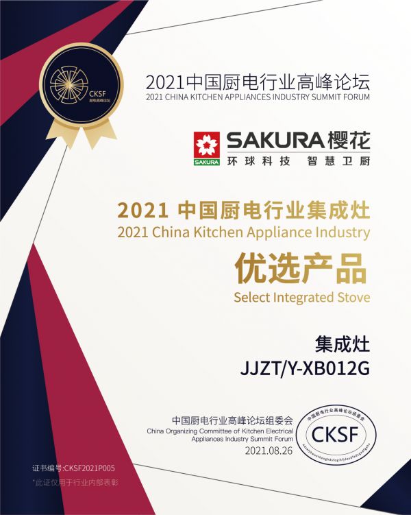 (樱花卫厨集成灶JJZT/Y-XB012G荣获2021中国厨电行业集成灶优选产品)