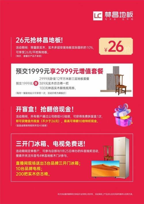 4.3台品牌三开门冰箱;10台品牌电视200把实木仿古椅免费送:搜索并关注抖音号#林昌地板木门#,可参与林昌地板于9月25日举办的抖音抽奖活动,公司将在抖音直播间(林昌地板木门)面向所有活动期间定单客户送出3台品牌三开门冰箱、10台品牌电视及200把实木仿古椅。