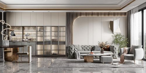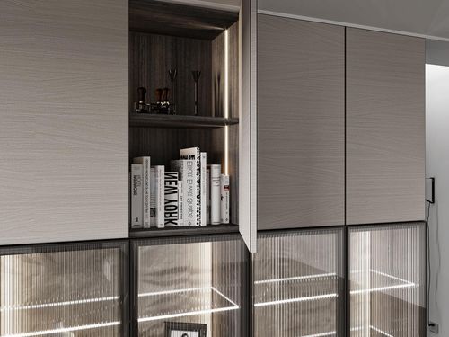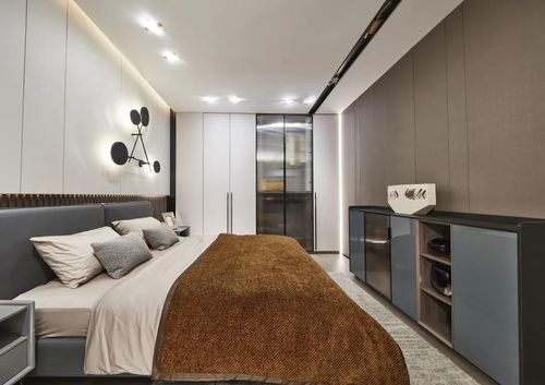 而在卧室中,则是配有超高门衣柜,其整体以灰白色调为主,让人视觉上更感舒适。并且衣柜的一侧还安装有磨砂玻璃门,使空间充满朦胧之美。另外,该系列的书柜同样是坚持简约原则,采用开放格与雨丝玻璃柜的组合方式,集收纳、装饰于一身,轻盈又通透。