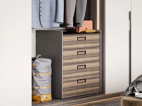 另外,该系列产品还采用了内嵌式拉手,其优点是侧边可任意卡入不同花色封边条,而且拉手本身有着很强的科技感与几何感,与门板搭配更显个性化,也符合现代人的审美习惯。而为了满足不同人群的消费需求,该系列还运用了窄边铝框门搭配普通门铰的方式,不仅让柜体整体质感轻盈,并且提升了性价比。