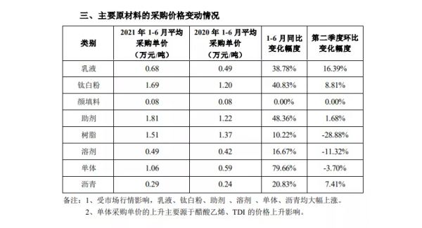 2021年1-6月,三棵树主要原材料的采购价格均出现不同程度的上涨,其中单体采购单价涨幅高达79.66%。这让三棵树的营业成本压力倍增。