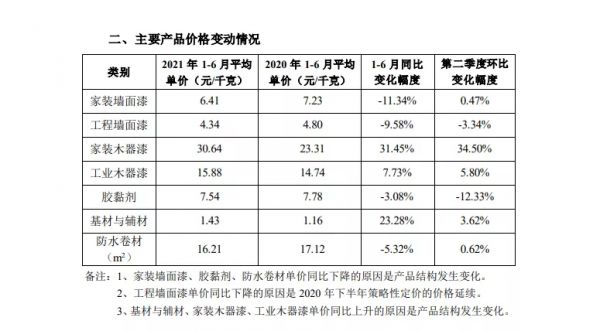 搜狐焦点家居整理相关资料发现,尽管原材料价格一路飙高,但三棵树却很长一段时间都选择按兵不动,直到今年3月才发布了第一轮涨价通知,而且根据三棵树1-6月主要经营数据报告显示,除了木器漆以及基材与辅料上调价格外,墙面漆、胶粘剂、防水卷材等反而同比下调了5%-11%不等,尤其是建筑墙面漆(家装+工程),合计下调了20.92%。