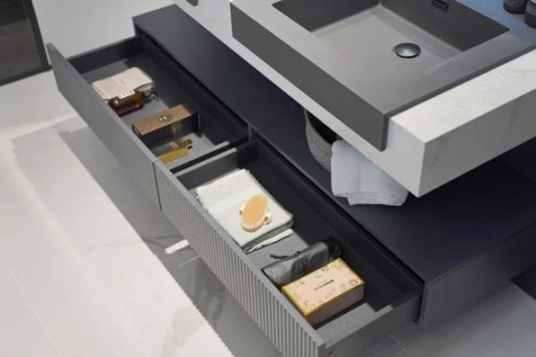 黑色金刚砂半挂盆搭配寒江雪岩板,精致时尚,品质感十足。上下分离,左右分区,不同品类独立收纳更整洁。内置开放格设计,放置常用物品,拿取顺手。细节的处理和材质的选择透漏出高级气息。