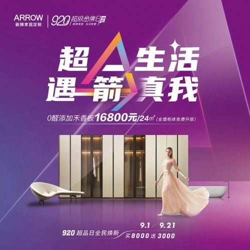 体验超A生活,就来箭牌920箭牌超级品牌日!活动期间箭牌家居定制以最实惠的价格,为你打造高品质的家,一年一度的狂欢盛宴,全年最大的优惠力度,还有超多惊喜福利等你解锁!