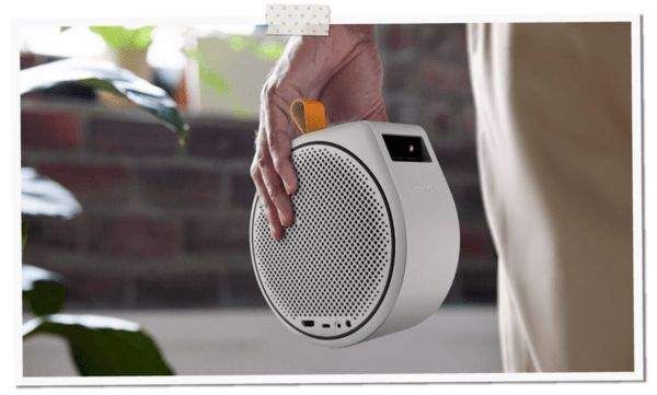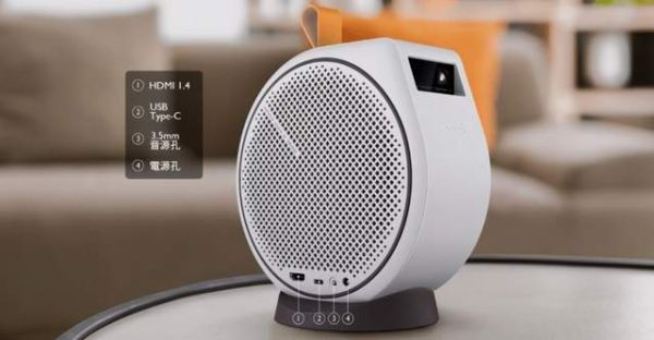 从外形上来看,明基GV30像一个小音箱,全白配色,在顶部还有一个皮革拉环设计,方便携带,同时明基GV30还内置电池,大约能续航2.5小时。这款投影仪同时还配备一个底座,可以放置在桌面上。