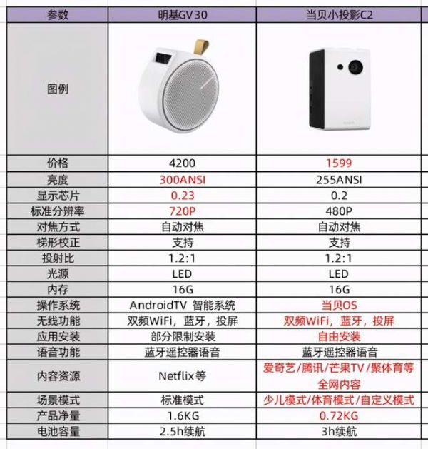 在外形上大家都有一个了解了,现在就让我们从参数入手来看看明基GV30值不值得购买,小编将同为内置电池的便携投影当贝C2作为对比参照项,说完背景,直接看参数表吧!