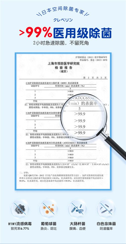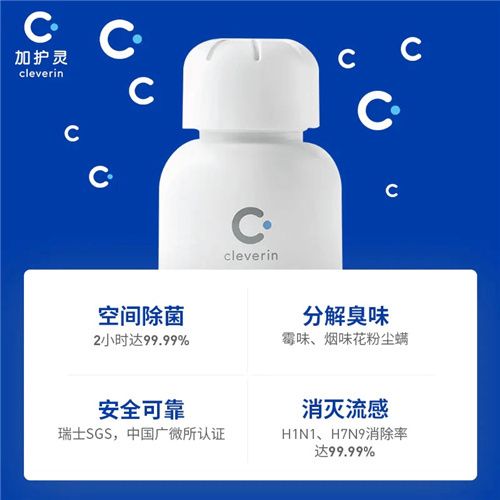 它跳出了传统的单点式除菌方式(只有喷洒过消毒剂的地方才会被除菌),主动释放二氧化氯气体,同时作用于空气和物表,开创了“3D式”空间除菌的新方式,在无形中为人类构建了一层空间防护罩。据权威机构检测认证,在使用加护灵2小时后,甲醛去除率可达96.7%、空气细菌杀灭率可到99.94%、流感病毒H1N1去除率可达99.99%。