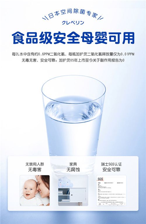 能够确保加护灵全程无污染的专利技术便是二氧化氯缓释技术,它可以将二氧化氯释放浓度精准控制在0.01ppm左右,比我们平时喝水摄入的二氧化氯浓度还要低,既不会对人体造成伤害,还能有效清除室内空气污染物,老人、孩子都可放心使用。据了解,这一标准于2014年被日本二氧化氯工业协会确定为二氧化氯气体在室内释放浓度的安全标准,可长期使用,安心无忧。