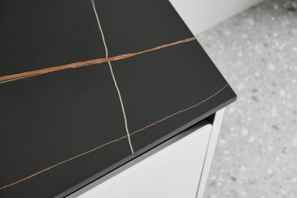 劳伦黑金岩板,岩板界贵族新宠,独特金白纹交错纵横在霸气炫酷的哑光黑底,犹如流星划破苍穹,呈条纹几何图形,深邃神秘,新奢不凡,彰显瑰丽气度。