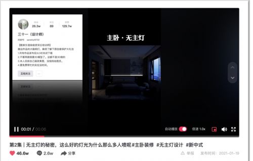 家居短视频赛道的里程碑,是2020年疫情期间,酷家乐在行业首推生长动画功能。这款视频风口下推出的新应用,在抖音等短视频平台上屡见刷屏。家居行业也从依赖实景拍摄的视频1.0阶段,迈入通过渲染制作的视频2.0阶段。