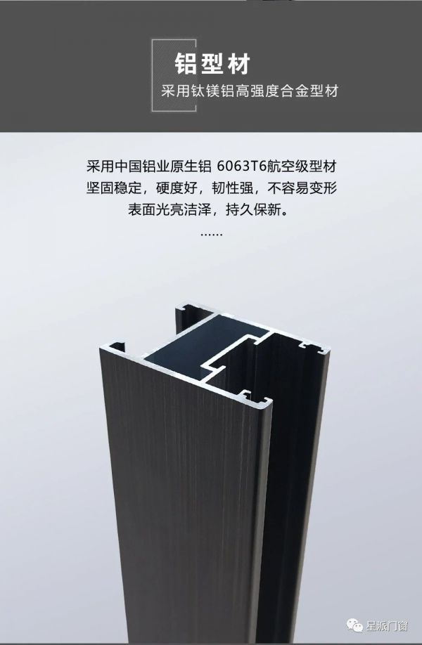 一般做家装产品,门窗厂多数选用出材率高的产品也就是壁厚比较薄的产品以降低造价,而普通铝合金门窗单腔体,而且壁比较薄声音容易穿透。而星派门窗选用的是多腔体结构,型材断面壁厚严格遵循国家标准,必须在1.4mm以上,因为壁厚薄关系到组装技术和组成门窗的隔音问题。同时这种高强度铝型材,坚固稳定,硬度好,韧性强,不容易变形。