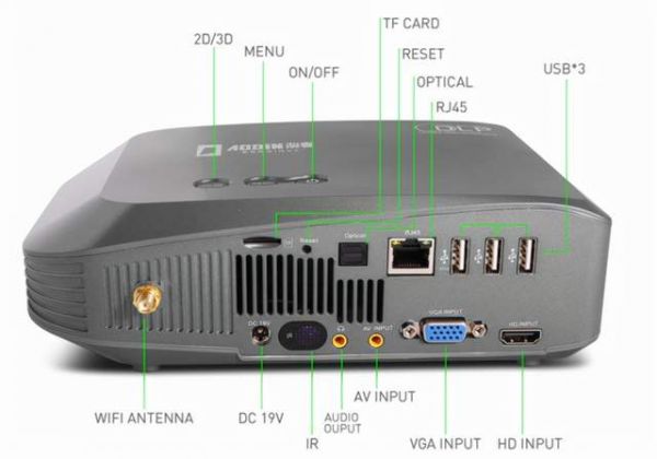 首先我们来看一下这款投影的接口吧,在接口方面这款投影的配置非常的丰富,除了常规的USB接口、HDMI接口、之外还有VGA接口、LAN网线接口以及音频的输入及输出接口。在配置上,这款投影搭载了0.45DMD显示芯片,所以分辨率可以达到真实的720P分辨率。处理器方面则采用了4+32GB的大内存配置,处理器搭载了瑞芯微的RK3288处理器,亮度为1500流明,不建议白天使用。