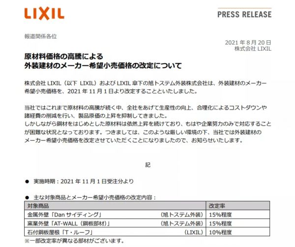 8月20日,骊住发公告称,LIXIL株式会社及旗下的旭tostem外装株式会社,将自2021年11月1日起上调外装产品的零售价。骊住表示,在原材料价格持续上涨的形势下,公司已以提高生产效率、削减成本等方式抑制产品价格上涨。