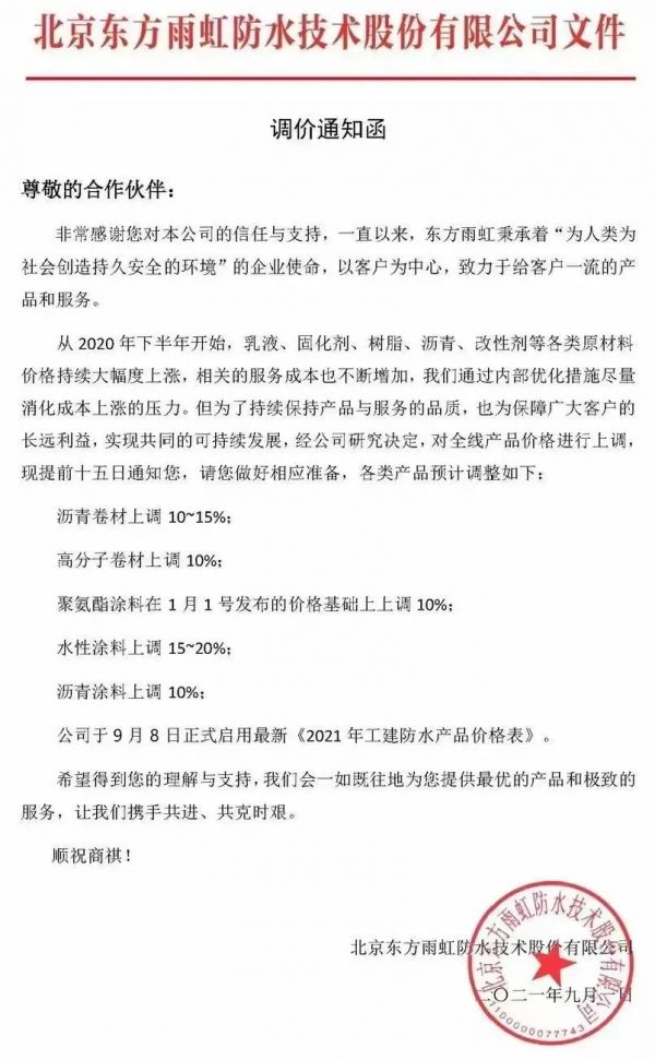 9月1日,东方雨虹发布涨价通知函,宣布上调全线产品价格,并于9月8日正式启用最新《2021年工建防水产品价格表》。