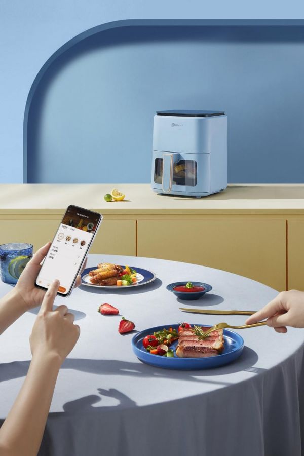 外表靓丽的雾霾蓝配色自带满满高级感,充分满足了消费者对家电外表精致度的需求。悠伴可视智能空气炸锅的一大亮点就是它的可视窗口,双层的隔热玻璃窗口和内置照明灯设计在保证安全的前提下能够更清晰直观地展现食物烹饪进程,方便随时调整烹饪时间和温度,不用时刻被束缚在厨房,美味一眼就能看见。