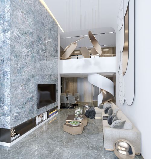 莫尼卡蓝金大规格连纹打造的背景墙,为空间定下了高级的基调,带来无限开阔的视觉效果,没有拥挤感和压迫感,让空间更加纯粹且有温度,与窗外的都市色彩交融互汇,颜色鲜艳的前卫装饰画点缀其间,空间多了些许灵动与欢快的气息。