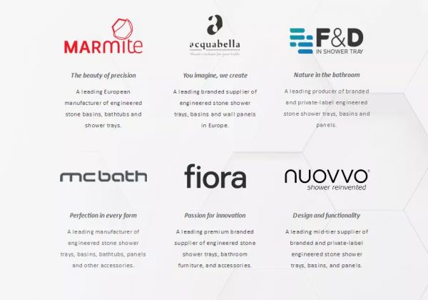 ES Group旗下拥有多个卫浴品牌据了解,目前欧洲市场淋浴盘品牌众多,但生产厂家不多,其中ES Group旗下的Marmite、Acquabella、F&D Group、Mcbath是最主要的4家,在合成淋浴盘市场份额上占到60%以上。鉴于此次收购的Fiora及Nuovvo也有生产淋浴盘,ES Group显然已成为欧洲市场该品类的领导者。除了淋浴盘,ES Group近年也积极拓展其他业务,目前多个品牌均有生产及销售面盆、浴缸、浴室柜、浴室配件等产品。