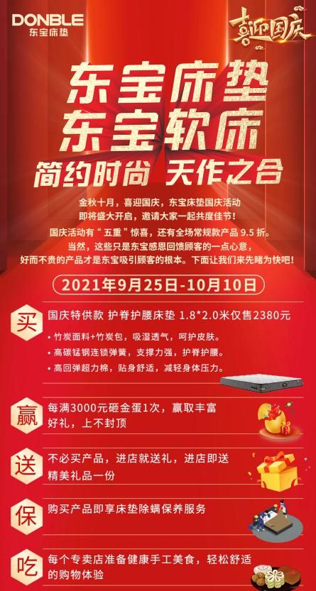 金九银十,又到了黄金家装季,国庆小长假与其去人挤人,不如来东宝床垫选寝具。为了真诚回馈广大消费者对东宝床垫的支持与认可,9月25日-10月10日期间,东宝床垫为广大顾客献上国庆好礼。