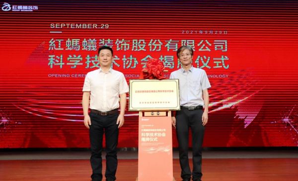 ▲苏州市姑苏区科协主席张杰和红蚂蚁科协主席李荣为红蚂蚁装饰股份有限公司科学技术协会揭牌。