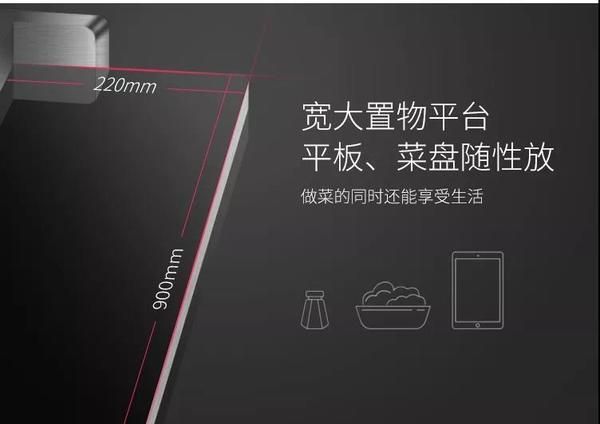 220mm*900mm宽大置物平台,8寸盘、鱼盘都能轻松放下。日常炒菜可以炒完直接放在置物台上加热,炒完的三个菜加热、左边炉灶煲汤、右边炉灶炒菜,煲好汤菜出锅,将四菜一汤端上桌子就能享用。