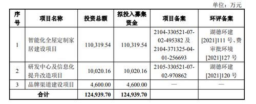 据招股说明书显示,本次募集资金12.49亿元,主要投入“智能化全屋定制家居建设项目”“研发中心及信息化提升改造项目”和“品牌渠道项目”。其中智能化全屋定制家居建设项目拟投入募集资金11.03亿元,占整体募集资金的88%。公告中称,公司根据市场发展状况,计划扩大全屋定制产品的产能,并加强研发系统和信息化建设、渠道建设,对公司定制家居、装饰材料、木地板等业务提供技术研发支持和销售管理支持。项目建成达产后,预计新增年产80万套智能化全屋定制家居产品。