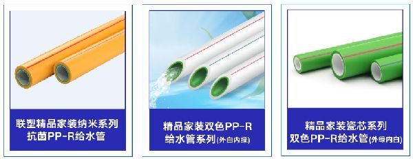 在家装给水应用领域,联塑精品家装管推出了联塑精品家装纳米系列抗菌PP-R给水管、联塑精品家装双色PP-R给水管系列、联塑精品家装瓷芯系列双色PP-R给水管等产品,所有PP-R管均采用优质原材料、进口生产设备制造而成,注重环保健康性,是家装给水管则的优选。