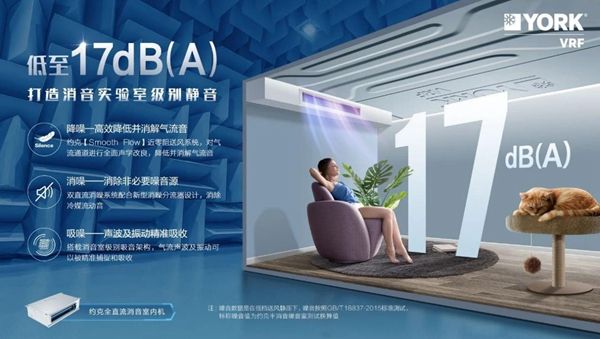 约克天氟地水系列中央空调采用实验室级别吸音架构,以降、消、吸三重手段降低运行噪音,打造17dB(A)臻静质感,赶走扰人清梦的声源。