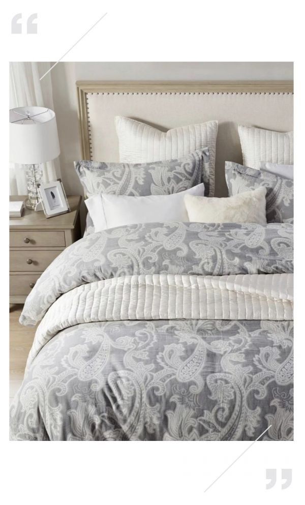 同样是好搭的灰调,Paisley床品系列却将经典的装饰图案“佩兹利花纹”进行了现代性的素净演绎。