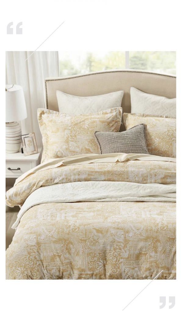 Giovanna四件套的花纹为传统卷草花鸟图案,其经由剪影的方式篆刻在斑驳的卡其色底,再运用拙拙的边缘处理、点线面的镂空设计,既保留了传统构图的平衡风格又展现了现代大众审美,让传统不再传统,焕发出细腻恬然的艺术美感。