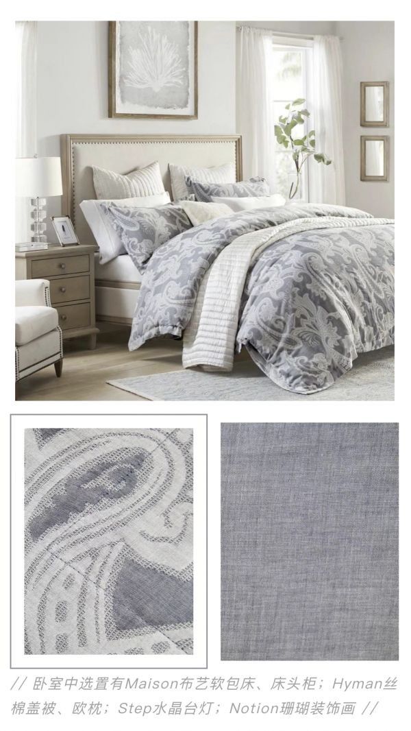 同时,床品用双层色织提花工艺来区分色彩的层次,从而增加了细微之美引人流连。在构图上,选用活泼、有动感的排列让中性的佩兹利图案以一种灵动的面貌呈现在家的面前。