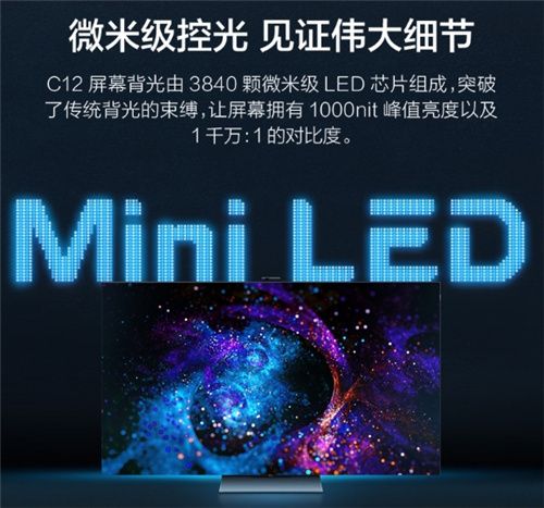 TCL C12量子点Mini LED智屏采用了目前显示行业最领先的技术——Mini LED,背光由3840颗微米级Mini LED芯片组成,共有240个背光分区,让屏幕拥有1000nit峰值亮度以及1千万:1对比度和1000nits的峰值亮度,加上量子点Pro的加持,实现了157% (BT.709)色域覆盖。