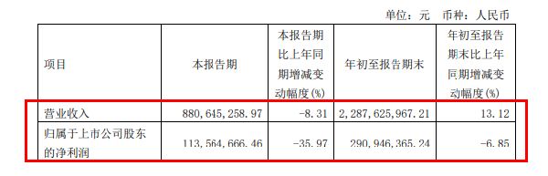 其中第三季度实现营业收入约8.81亿元,同比下降8.31%,实现归属于上市公司股东的净利润约1.14亿元,同比下降35.97%。