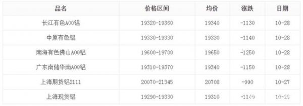 新浪门窗频道讯 今现货铝价大跌。各地区的具体的铝价格涨跌幅情况如下图,其中长江有色A00铝的均价为19340吨,下降1130元/吨;中原有色铝的均价为19330元/吨,下降1140元/吨;南海有色佛山A00铝的均价为19650吨,下降1250元/吨;广东南储华南A00铝的均价为19340吨,下降1150元/吨;上海期货铝2106的均价20708元/吨,下降990元/吨;上海现货铝的均价为19310元/吨,下降110元/吨。