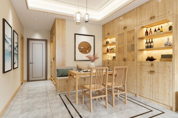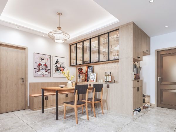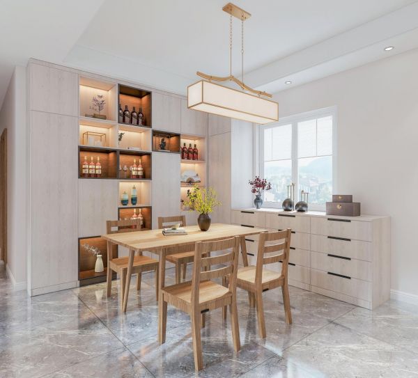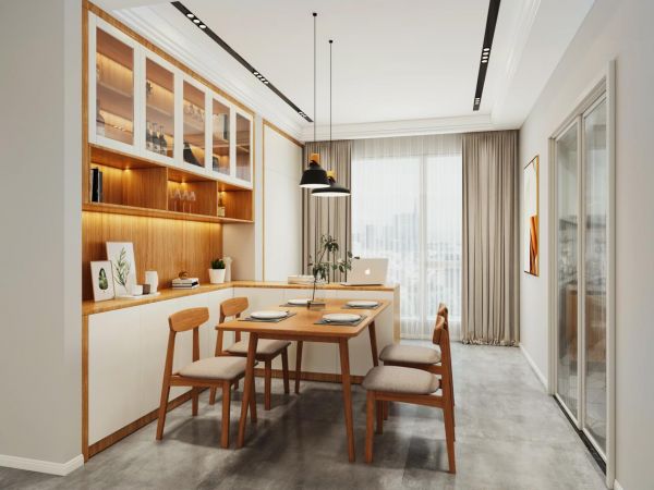 餐厅在墙面做了餐边柜之后,可能还是会存在一些位置没法做整墙的柜子,这时候利用转角空间,延展一点点半截的餐边柜或者直接买成品餐边柜放就再合适不过!